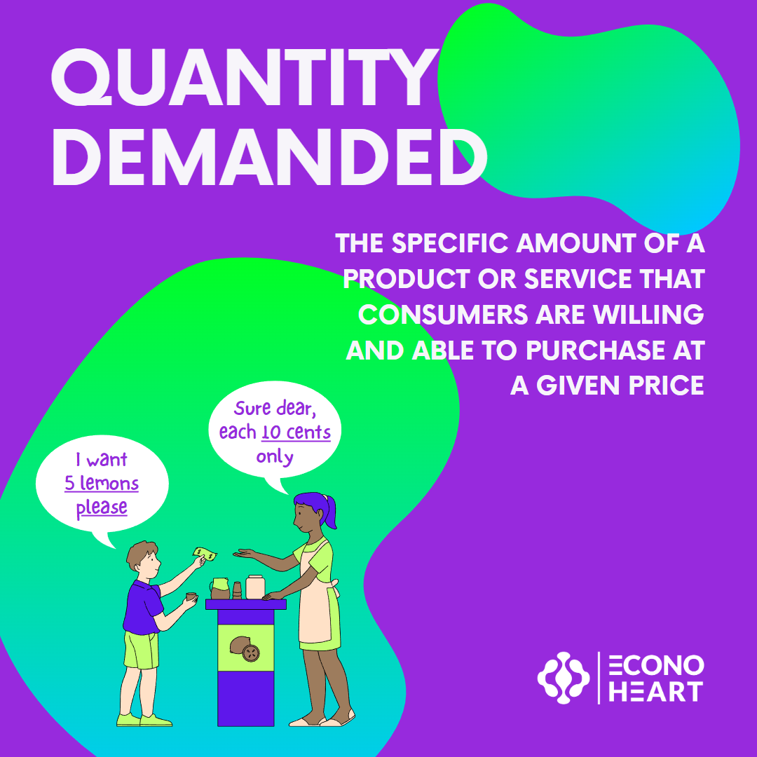 "Quantity demanded" is a term that we use to describe how much of something people want to buy at a certain price. For example, let's say you really like lemons, and you're willing to pay 10 cents for one lemon, buying a total amount of 5. The quantity demanded of lemons at that price (10 cents), would be the number of lemons (5, as in this example) that you and other people would want to buy at that price.